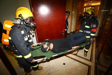 云梯车高空救人,“伤员”用担架抬出