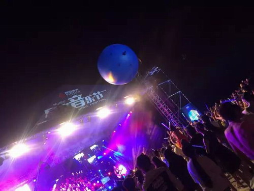 一阵热烈的摇滚拉开音乐节的帷幕,舞台炫目震撼的灯光效果,瞬间点燃现场的激情,荧光棒挥舞中,运动现场一直有观众加入进来,陶醉在音乐节的热闹气氛里。
